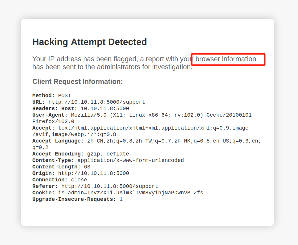 我们看一下被检测出攻击行为后的响应,会发现提示说我们的浏览器信息会被发送给administrator。所以尝试一下在user-agent字段尝试xss看能不能拿到admin的cookie登录